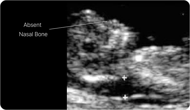 An absence of a fetal nasal bone, along with a thickened NT, is associated with a higher risk of Down syndrome.